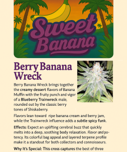 Berry Banana Wreck brings together the creamy dessert flavors of Banana Muffin with the fruity punch and vigor of a Blueberry Trainwreck male, rounded out by the classic berry tones of Shiskaberry.