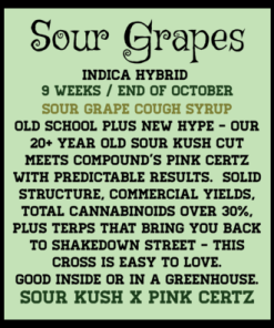 Old school plus new hype. Our 20+ year old Sour Kush meets Compound’s Pink Certz with predictable results. Solid structure, commercial yields, total cannabinoids over 30%. Plus terps that bring you back to Shakedown street. This cross is easy to love. Good inside or in a greenhouse.